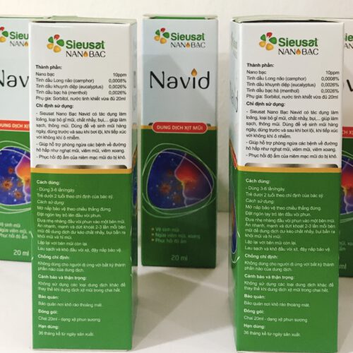 – Sieusat Nano Bạc Navid có tác dụng làm loãng, loại bỏ gỉ mũi, chất nhầy, bụi,…giúp làm sạch, thông mũi. Dùng để vệ sinh mũi hàng ngày, dùng trước và sau khi bơi lội, khi tiếp xúc với không khí ô nhiễm.